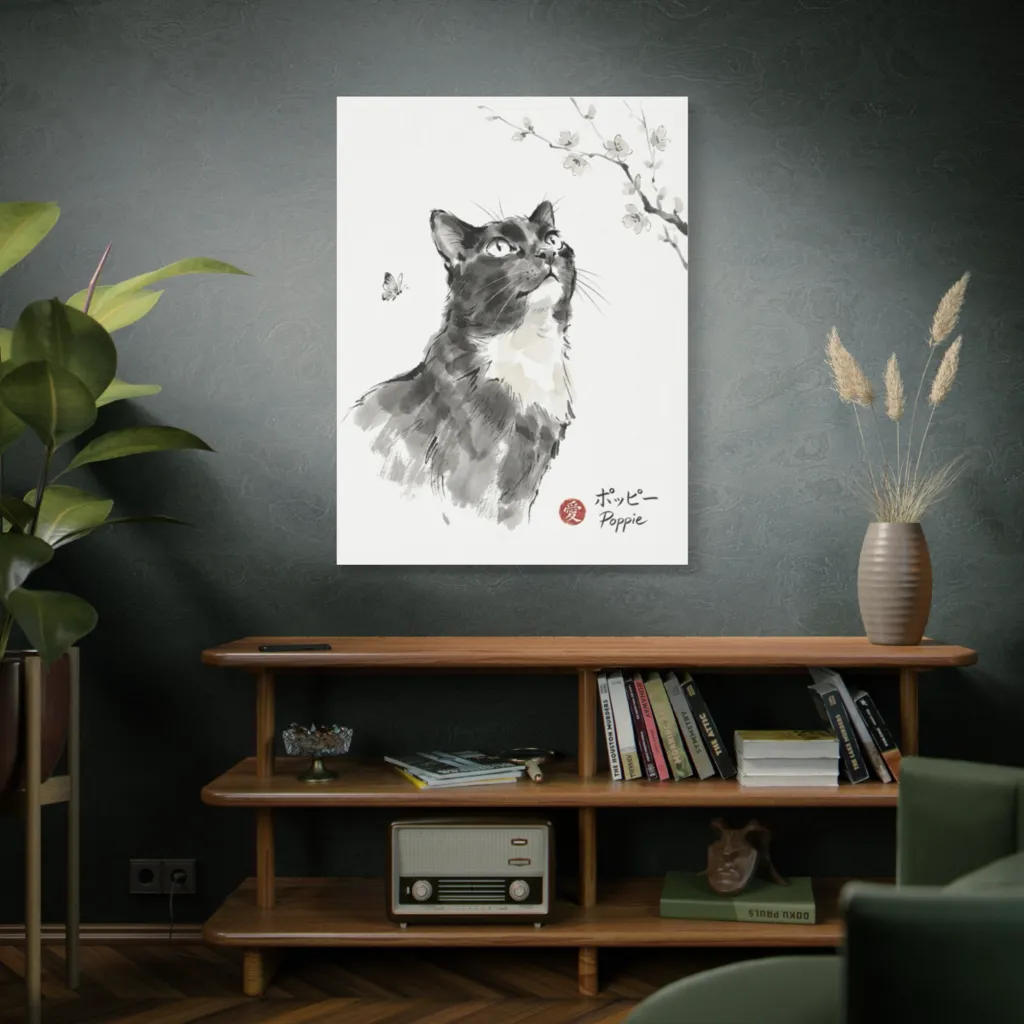 Sumi-e's elegant grayscale, with subtle blossom/butterfly chromatic pops, beautifully captures Poppie's curious grace. The harmonious tonal balance evokes serenity, contrasting with vibrant accents for emotional resonance. Masterful.