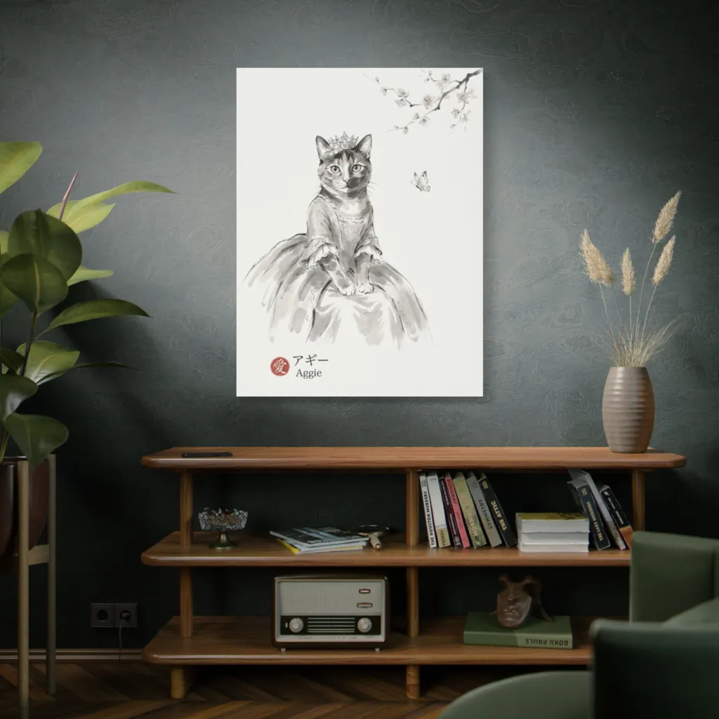 This piece exhibits masterful composition, with Aggie's regal presence commanding attention. The delicate sumi-e influence elevates it to an exhibition-worthy portrait, echoing classical elegance and poise.