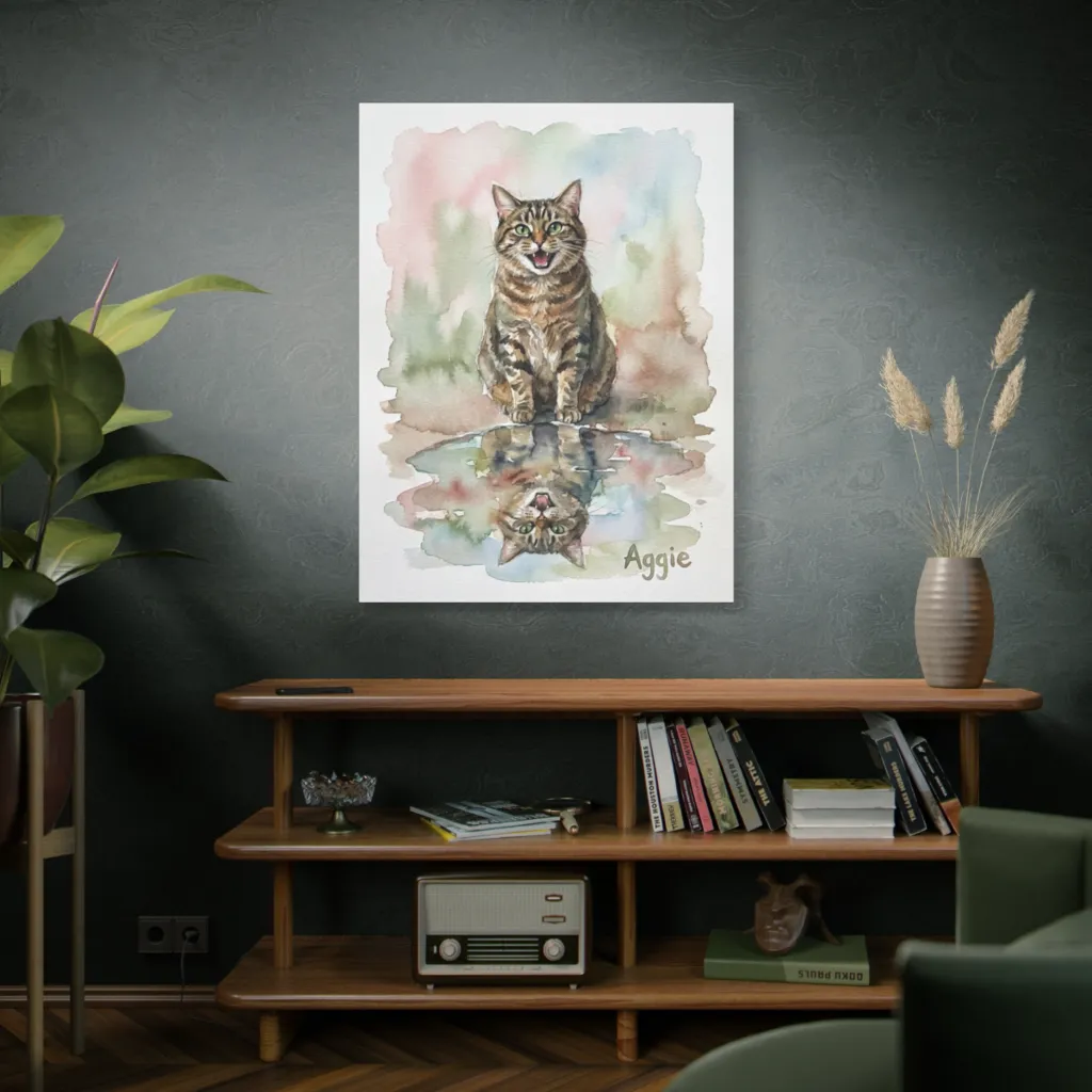 A vibrant watercolor captures a sassy tabby cat and its watery doppelgänger, reflecting a wonderfully whimsical mood. Aggie, ever the diva, practices her most dramatic meow for her adoring reflection.