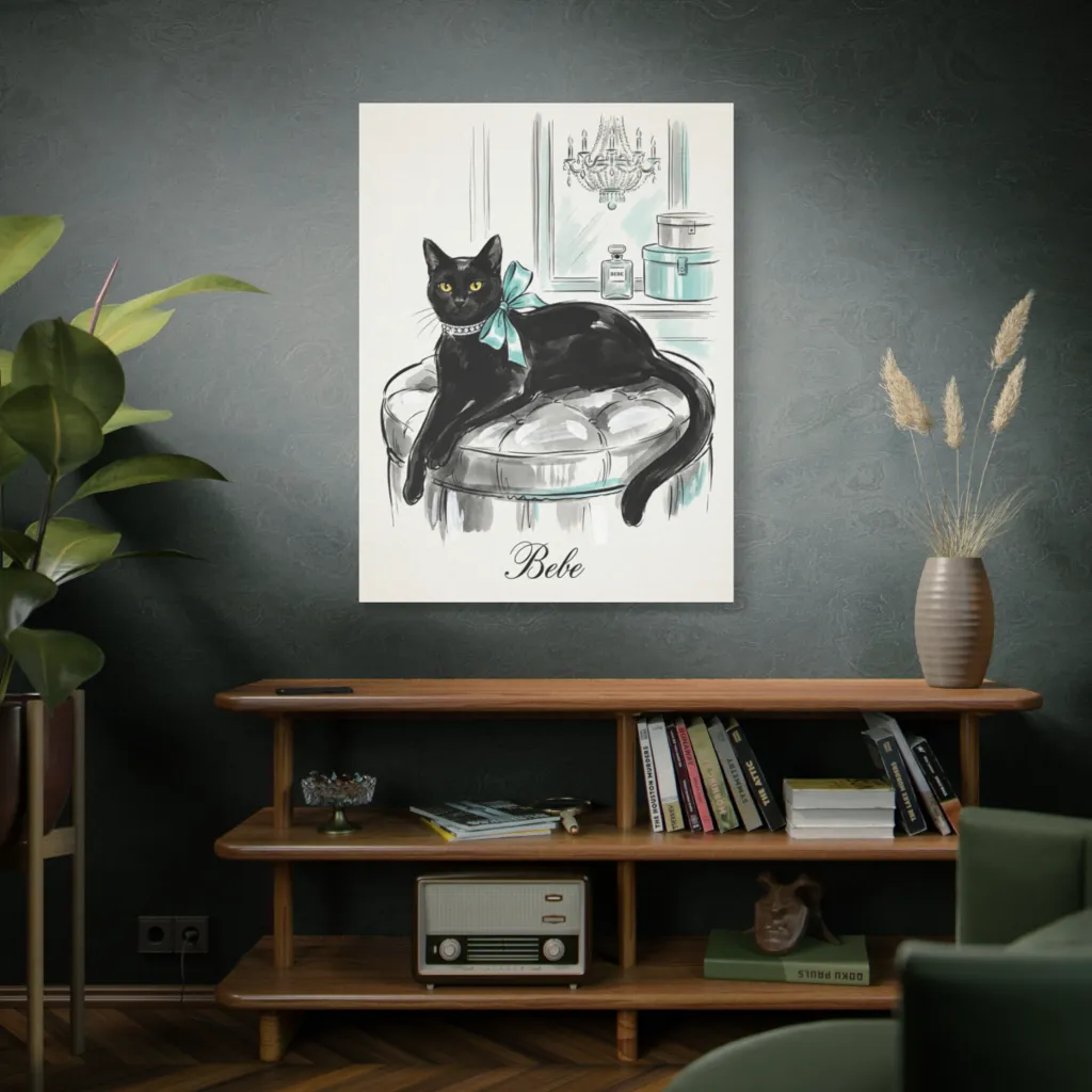 The aqua bow brilliantly pops against Bebe's dark fur, a cool chromatic harmony. Its high saturation enhances her playful charm, while pearls add neutral sophistication. A masterclass in resonant color choice, capturing her regal yet spirited essence. Brilliant!