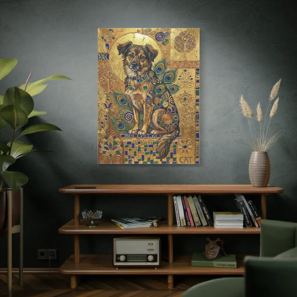 This opulent Byzantine-meets-Art-Nouveau portrait crowns a regal dog in shimmering gold and peacock jewels, embodying divine canine splendor.