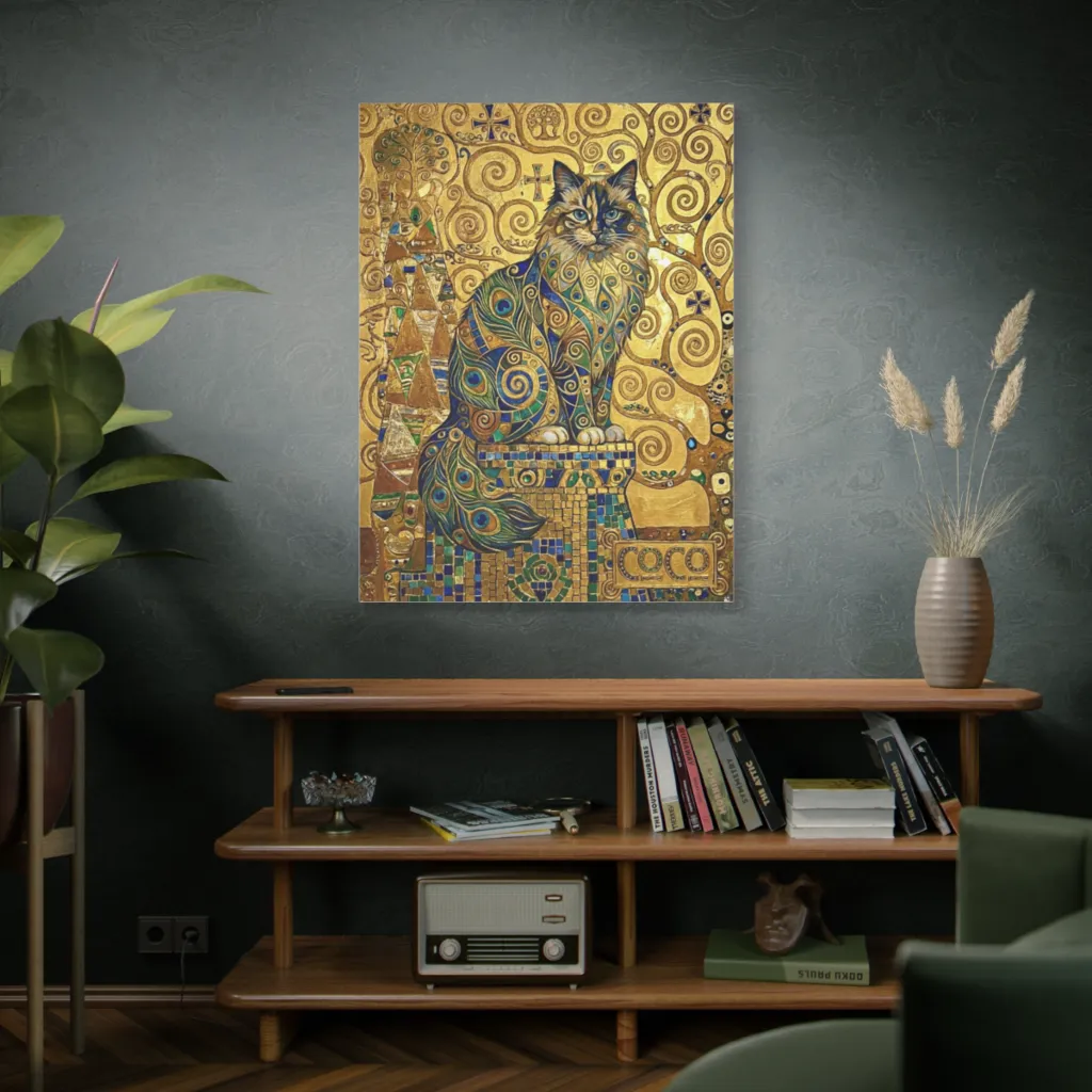 A majestic cat, rendered in opulent Klimt-esque gold and peacock patterns, gazes with mystical serenity from a decorative dreamscape.