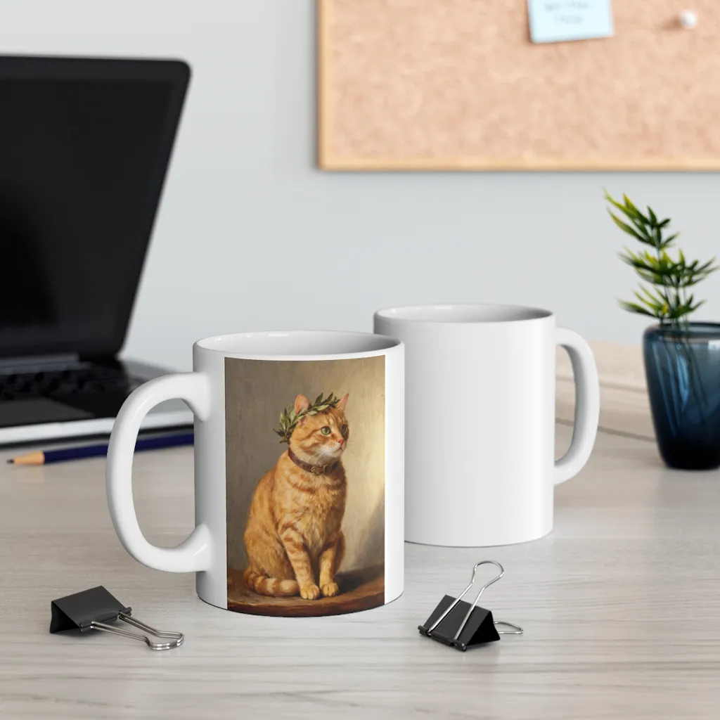 This regal tabby, sporting a victor's wreath, still looks like Garfield after realizing lasagna won't appear by divine right.
