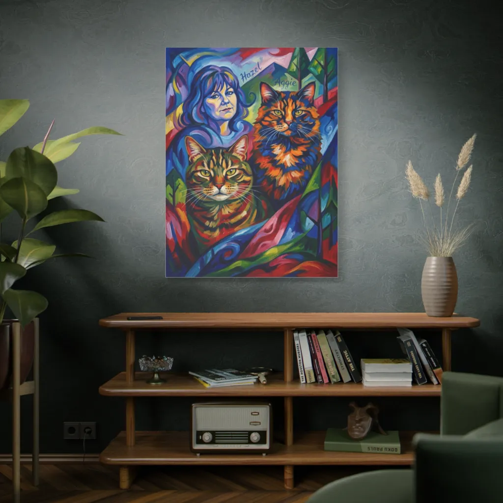 This portrait beautifully captures Hazel's contemplative spirit and Aggie's mischievous spark. Their vibrant patterns reveal distinct personalities, making them wonderfully unique companions. Truly special.