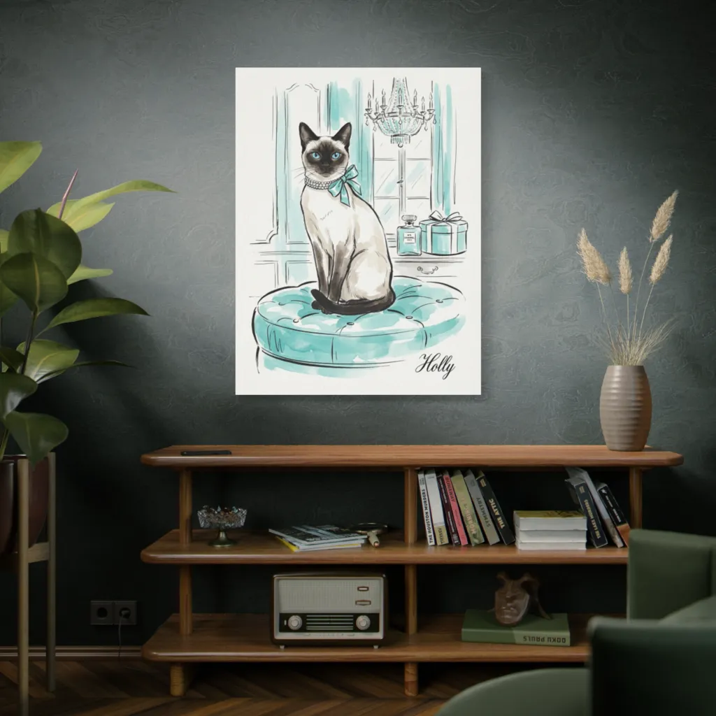 With painterly strokes, a sassy Siamese in pearls reigns queen of her elegant, Tiffany-hued boudoir.