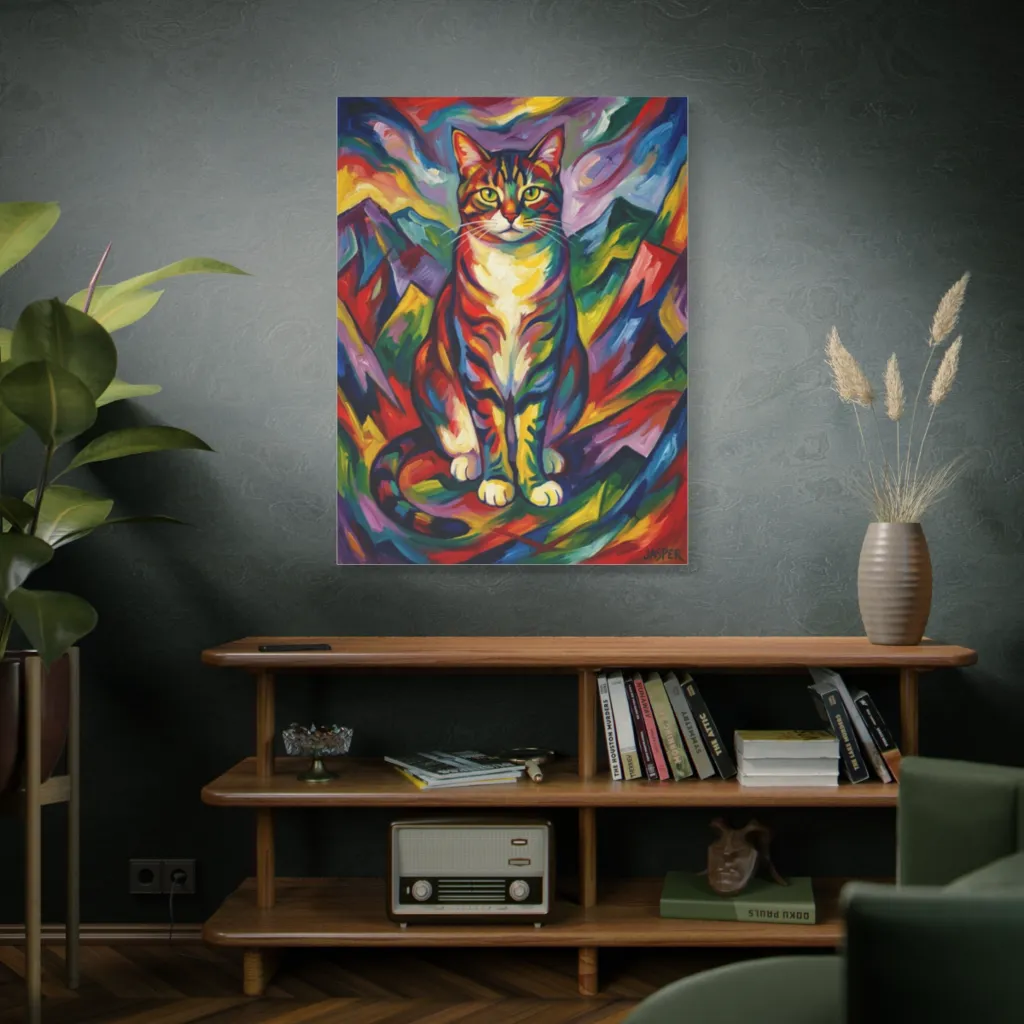 An expressive, rainbow-striped cat perches boldly against dynamic, colorful peaks, radiating a whimsical and intensely vibrant energy. Jasper unleashed a riot of color, creating a feline that's both majestic and ready for a psychedelic adventure.