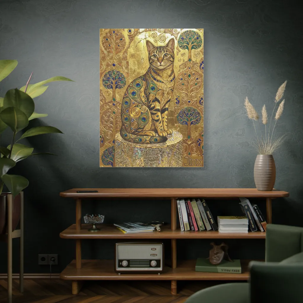 Jinx, a visceral gold-leaf deity! The avant-garde juxtaposition of feline serenity and peacock shimmer achieves tonal harmony. A truly evocative, Louvre-worthy marvel of brushwork.