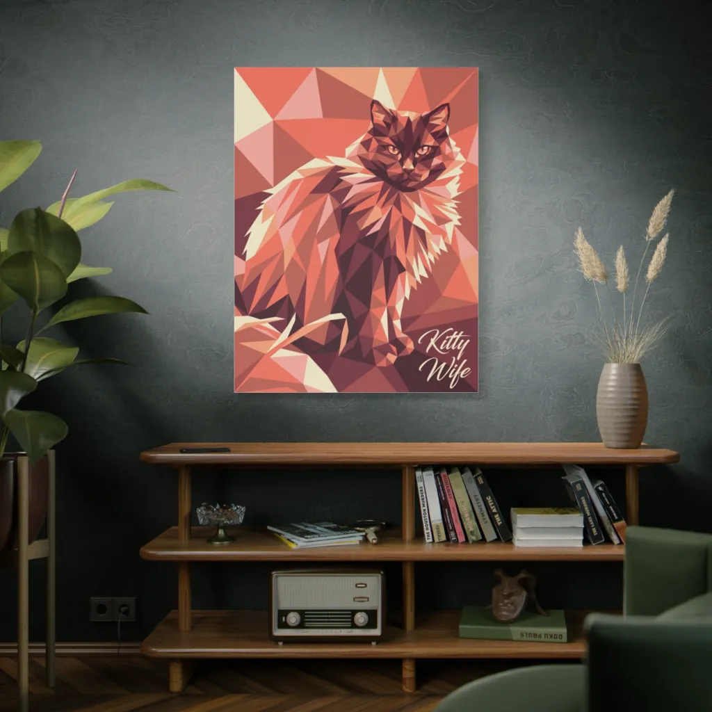 This geometric portrait of a majestic cat, rendered in warm angular hues, emanates a fierce, modern regal calm.