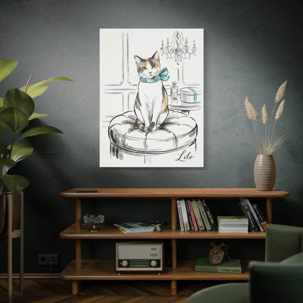 A chic ink-and-watercolor calico sits regally on a tufted ottoman, exuding pampered charm with her sparkling teal bow in this elegant, whimsical portrait.