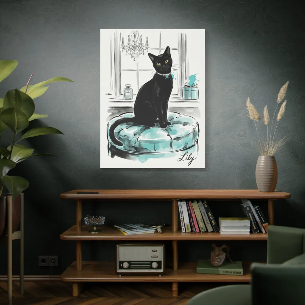This chic watercolor sketch features a diamond-collared black cat amidst luxury, exuding glamorous whimsy with a splash of Tiffany teal. Lily, the purr-fectly poised connoisseur, effortlessly models diamonds and designer accessories with feline grace.