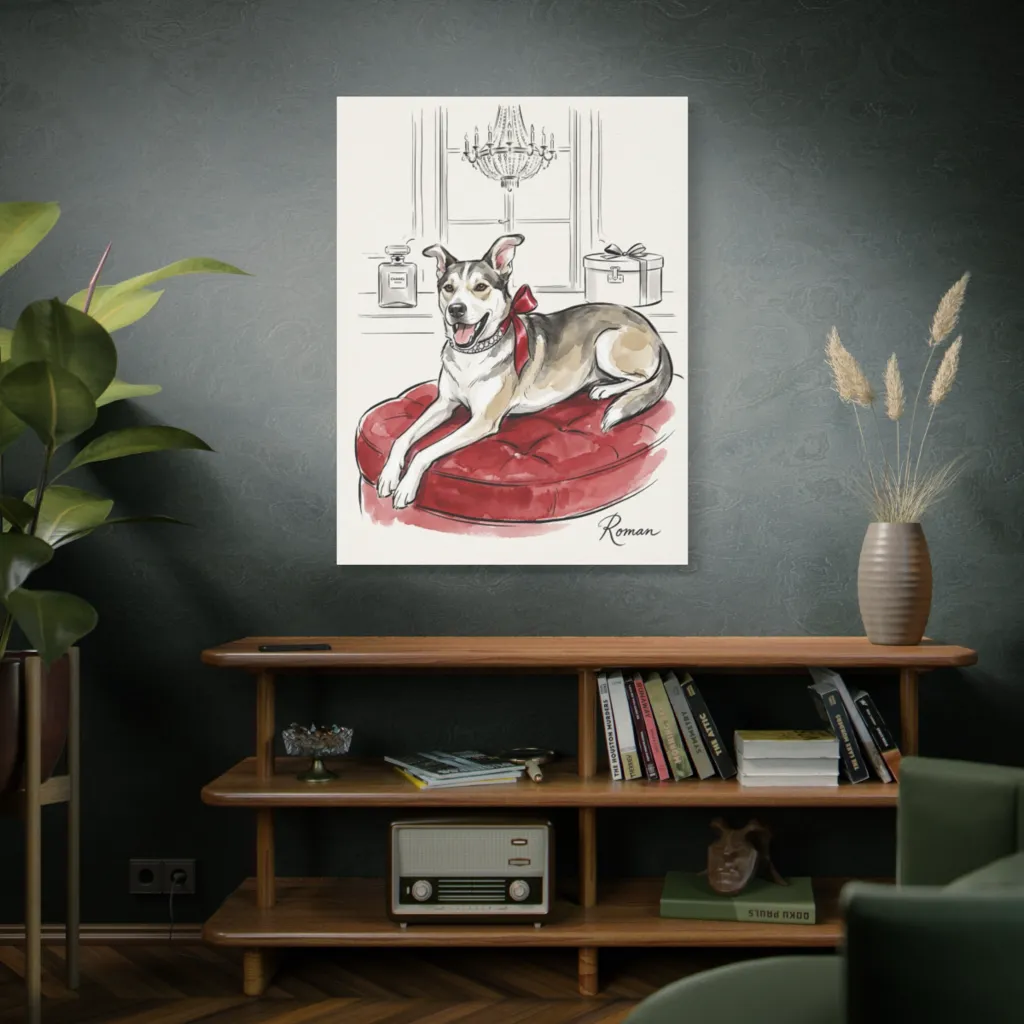 "Portrait of Roman in Red" possesses an undeniable presence. Its whimsical yet regal composition elevates pet portraiture into a delightful, modern Rococo-esque study, commanding discerning attention.