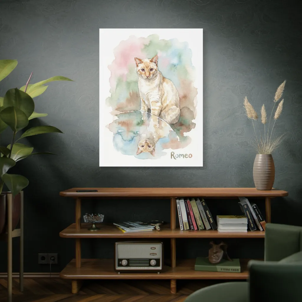 Luminous watercolors capture a ginger tabby and its watchful reflection, evoking a gentle, serene charm.