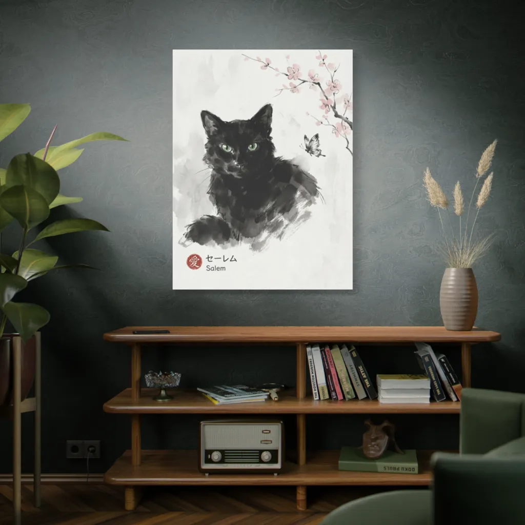 The sumi-e's tonal harmony and visceral brushwork, juxtaposing Salem's elegant vigil against ephemeral blossoms, evoke an avant-garde whimsy. A profound, almost spiritual meditation on feline ambition. Truly transcendent.