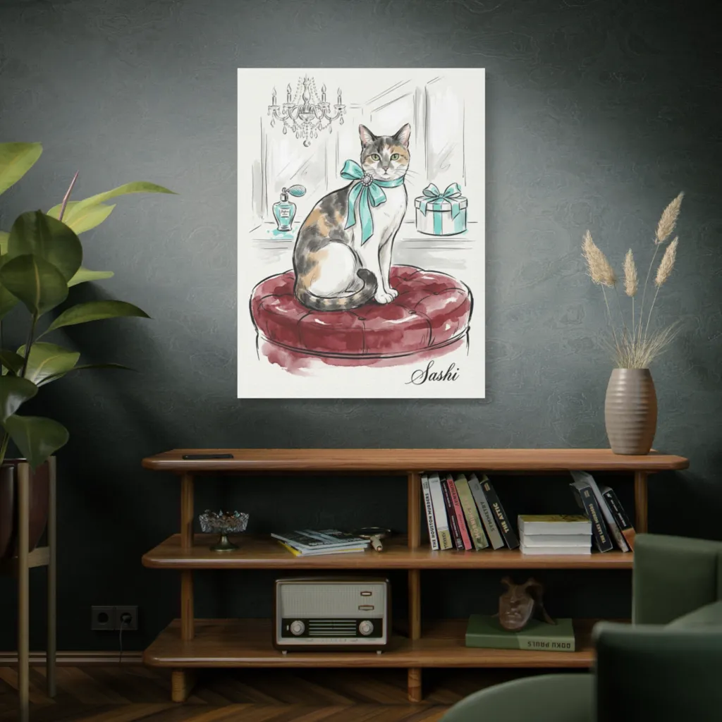 This elegant watercolor sketch captures a regal calico cat, bejeweled and poised on a plush ottoman, embodying pampered, whimsical luxury. Sashi, the ultimate feline fashionista, looks purr-fectly poised for her next luxurious rendezvous.