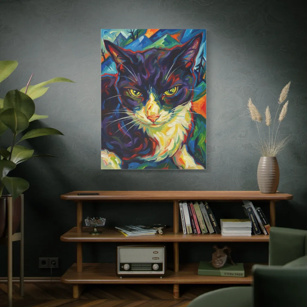 "Potus's Mountain Vigil" masterfully juxtaposes the visceral feline gaze with a kaleidoscopic geometry. The tonal harmony achieves an avant-garde drama. A truly significant modern masterpiece.