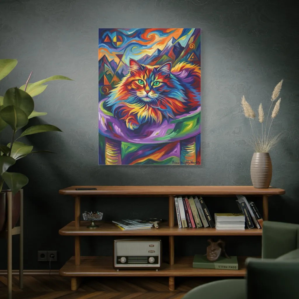 Prince Naughty Naughty, a technicolor feline monarch, clearly rules this vivid, mountainous dreamscape with his mesmerizing gaze.