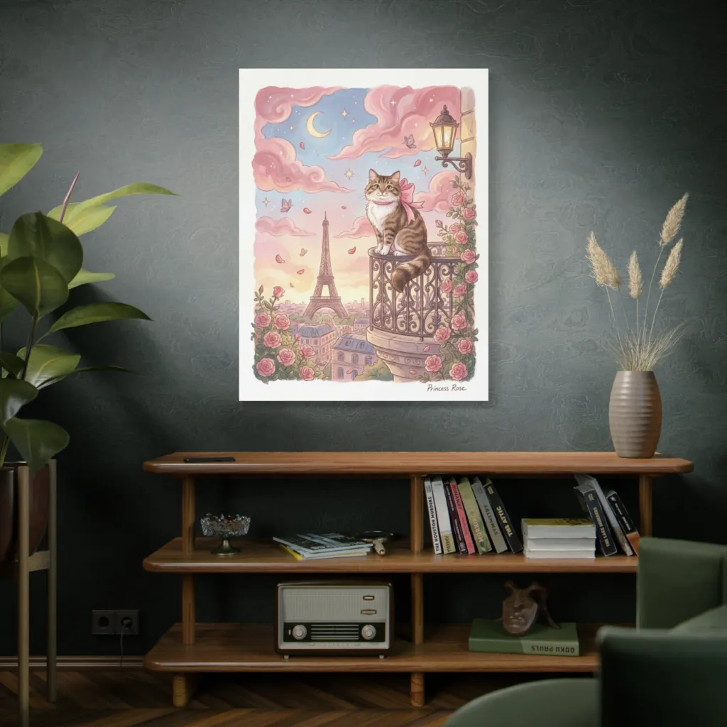 A whimsical watercolor whisks us to a pastel Paris, where a chic cat on a rose-decked balcony enjoys a dreamy, enchanting twilight view.