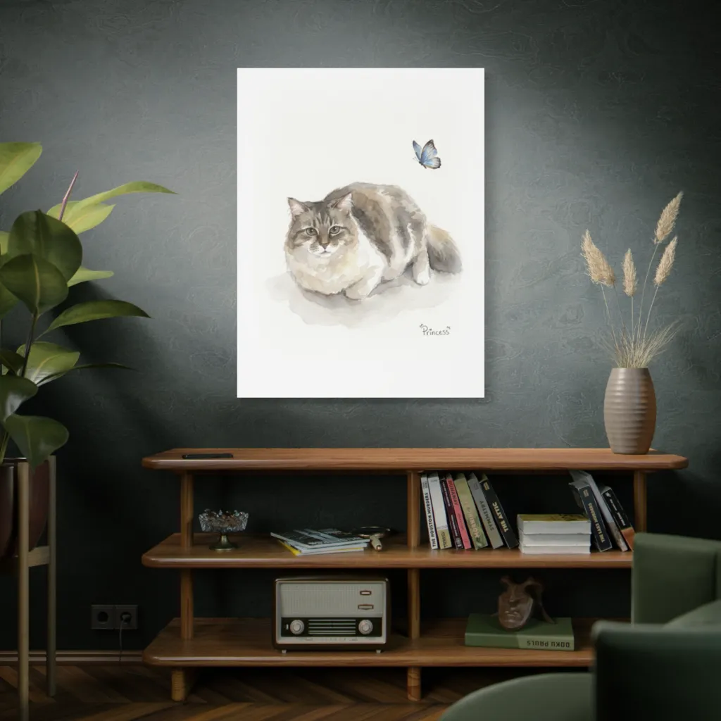 Soft watercolors capture a fluffy feline's watchful calm with a vibrant butterfly, evoking whimsical, gentle peace. Clearly, even Princess finds her royal calm momentarily disrupted by a tempting blue butterfly.