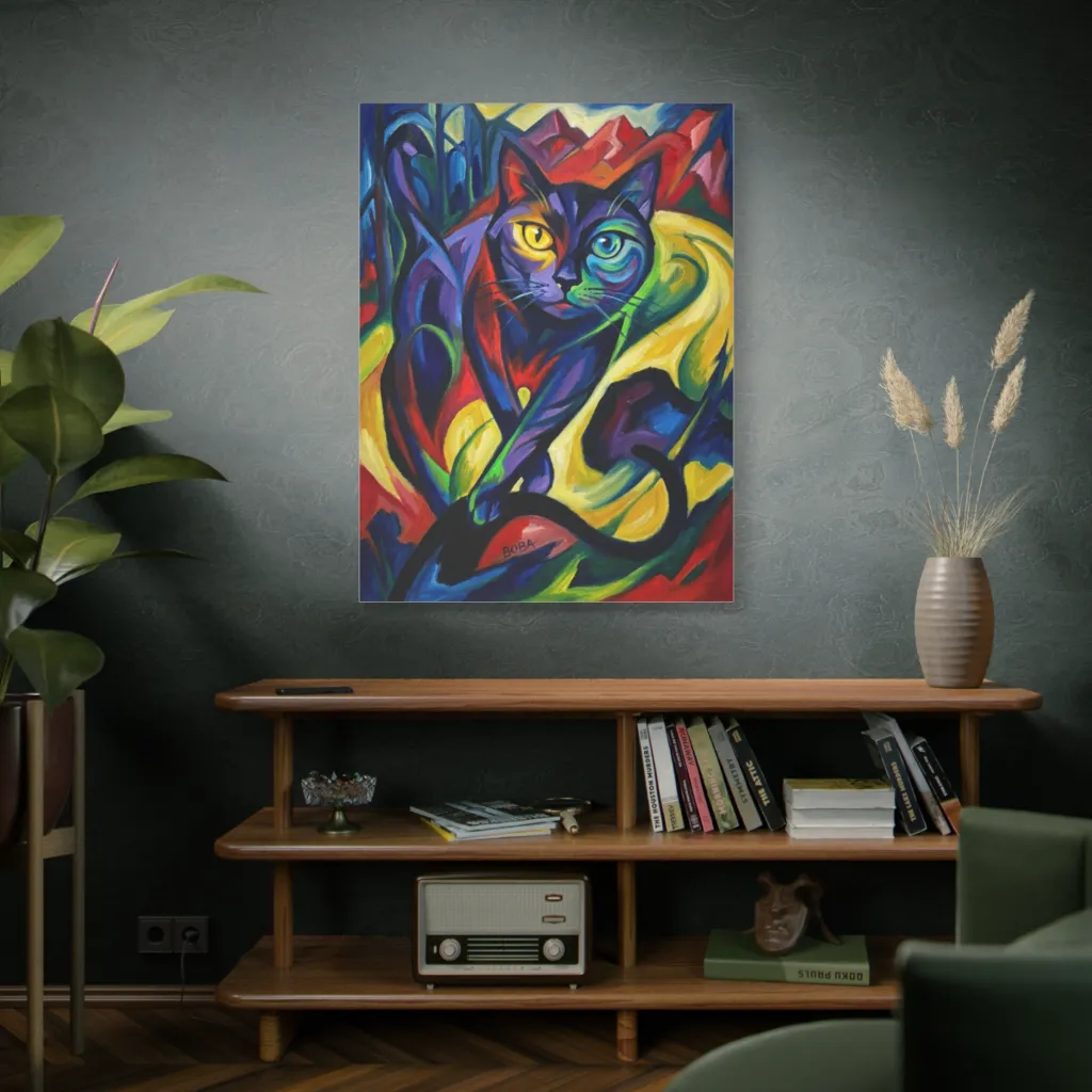 Boba's cubist forms and vibrant juxtaposition of hues offer a visceral, avant-garde spectacle. Its geometric intensity elevates pet portraiture to a high art, a veritable masterpiece commanding the intellectual gaze. Arresting.