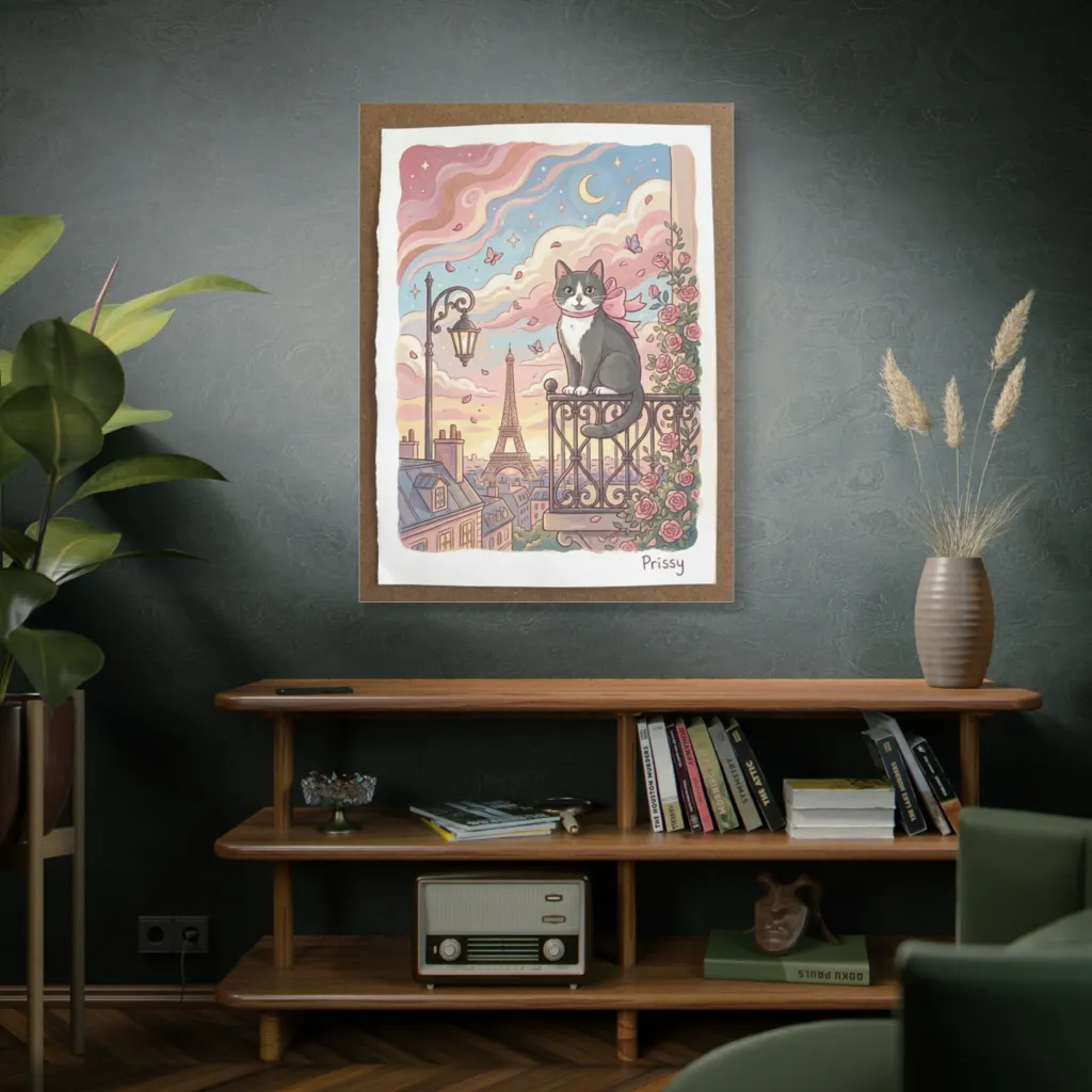 Prissy's Parisian Reverie is a tour de force! The juxtaposition of feline gravitas and pastel whimsy, a visceral tonal harmony. This avant-garde triumph elevates the domestic into high art. Bravo!