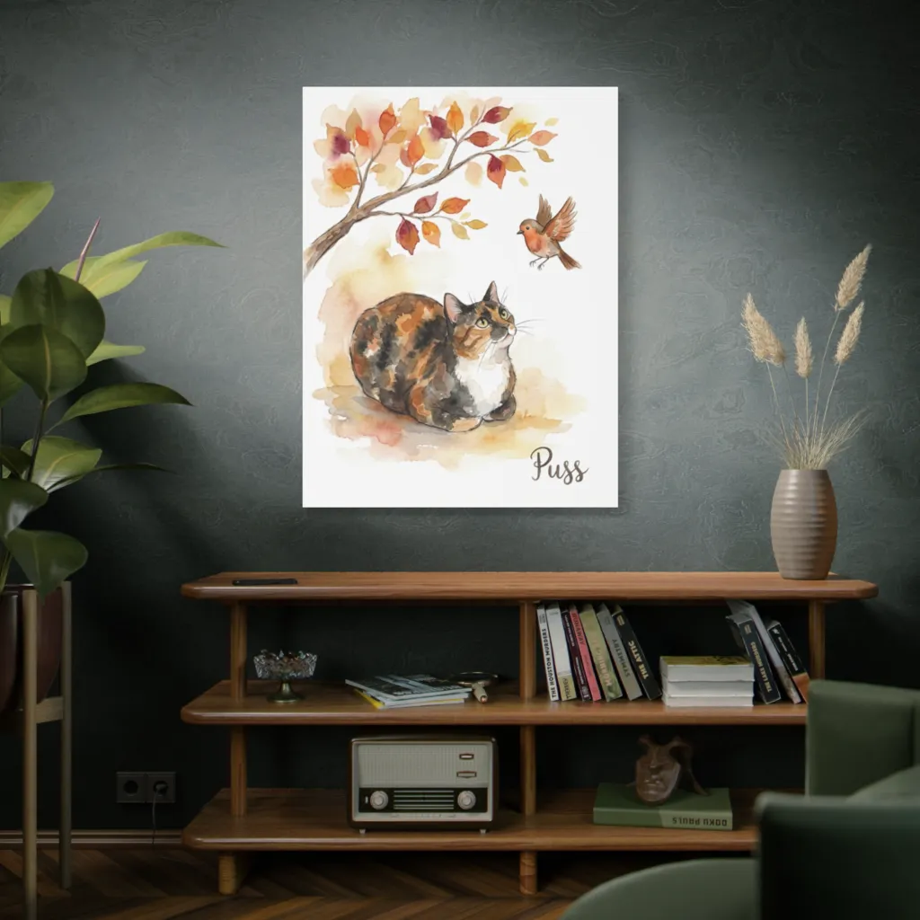This whimsical watercolor captures a curious calico cat eyeing a vibrant robin under an autumnal tree, radiating a charmingly serene, yet playful, mood.