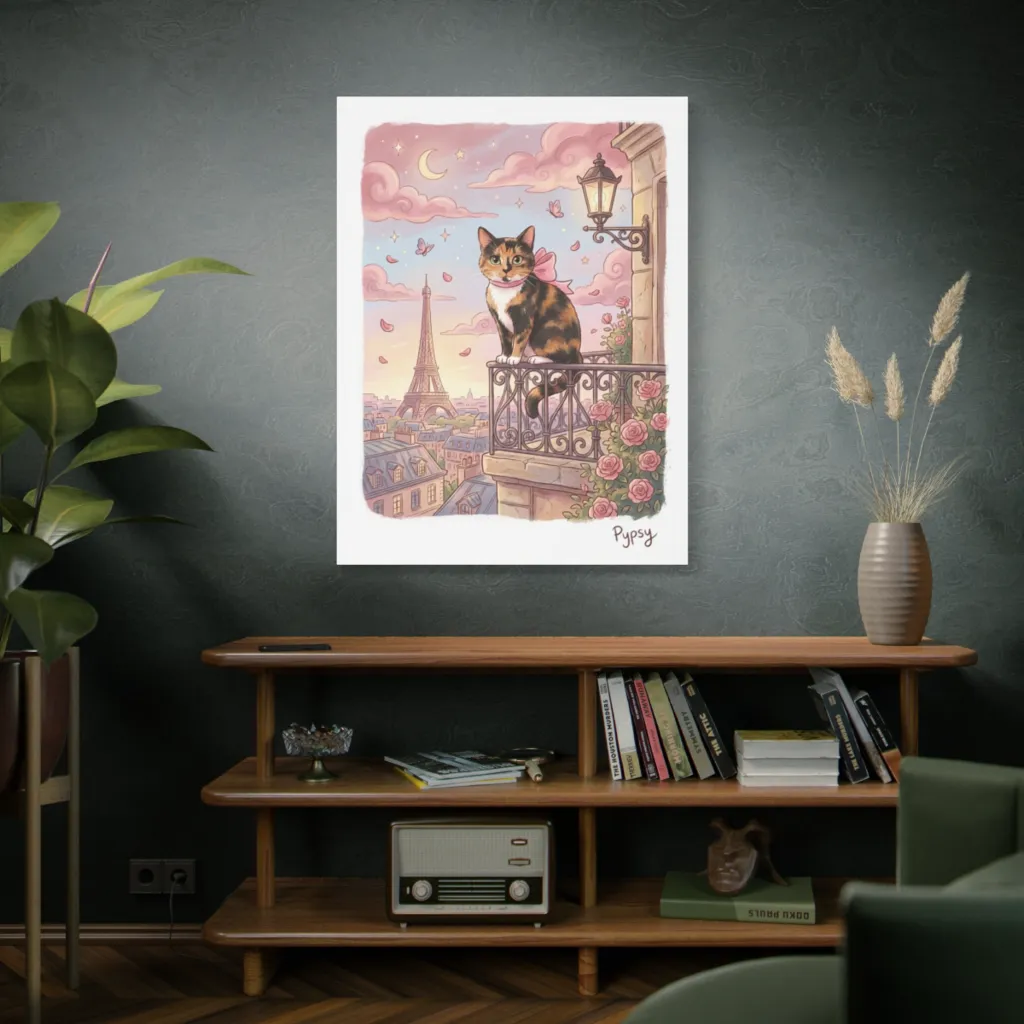 Pypsy's charming brushwork crafts a purr-fectly pastel Parisian dream, overseen by an adorably bowed feline.