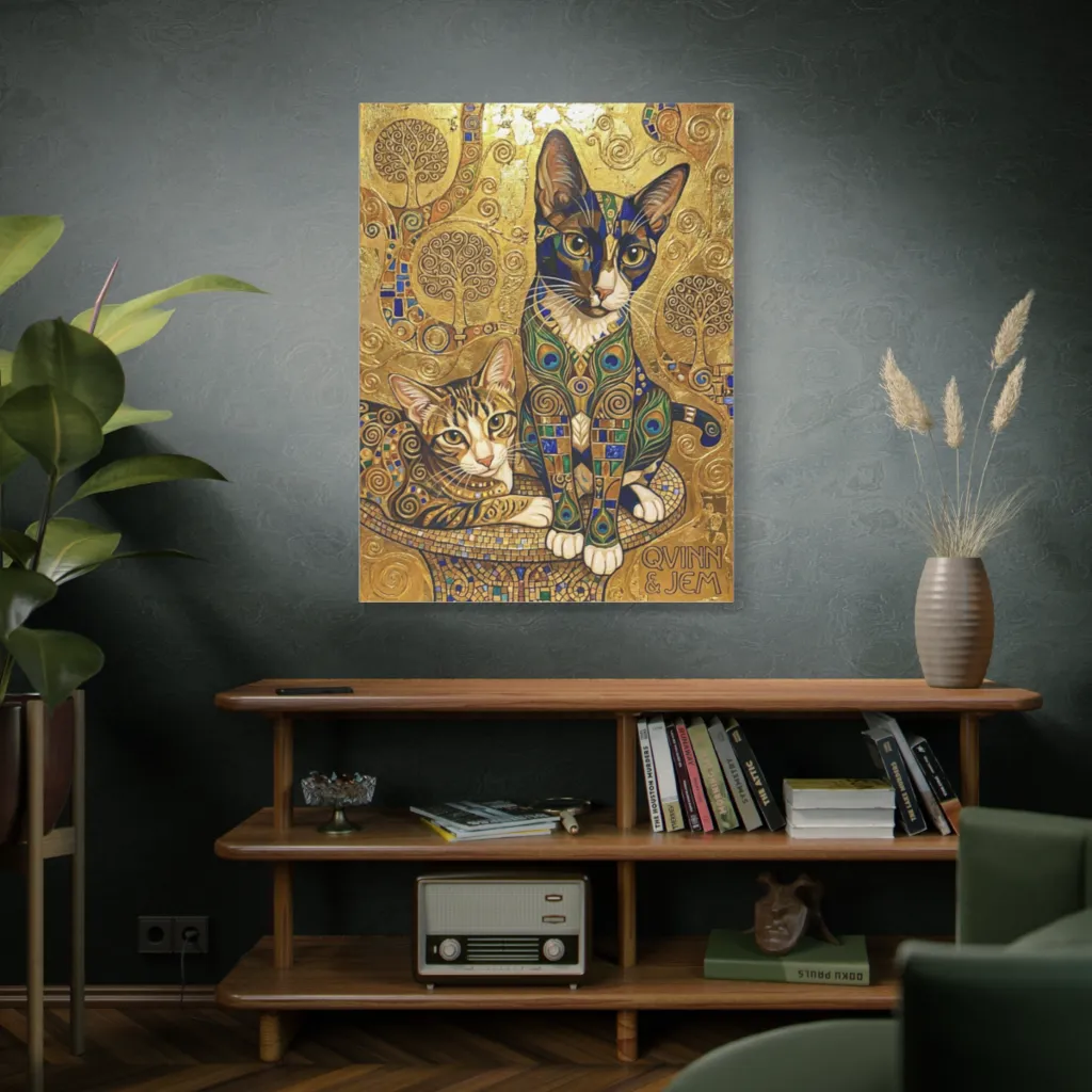 Klimt-esque cats, adorned in mosaics and gold, embody serene regality amidst shimmering, patterned grandeur.