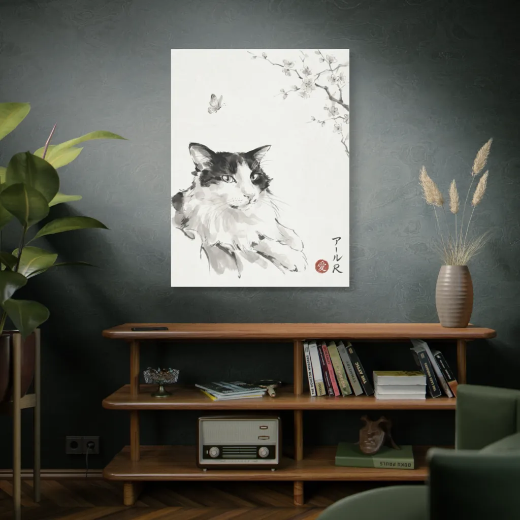 The sumi-e's subtle chromatic harmony, with delicate cherry blossom hues against the feline's dignified form, creates a serene, balanced warmth. Its understated saturation beautifully captures R's profound grace and contemplative energy.