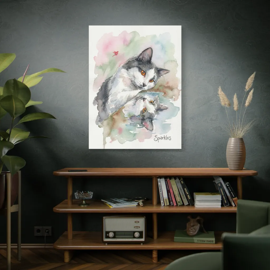 "Reverie of Sparkles" beautifully captures her curious spirit. The dreamy reflection and gentle expression reveal a soul full of wonder, making Sparkles truly special. A heartwarming portrait of a unique cat.