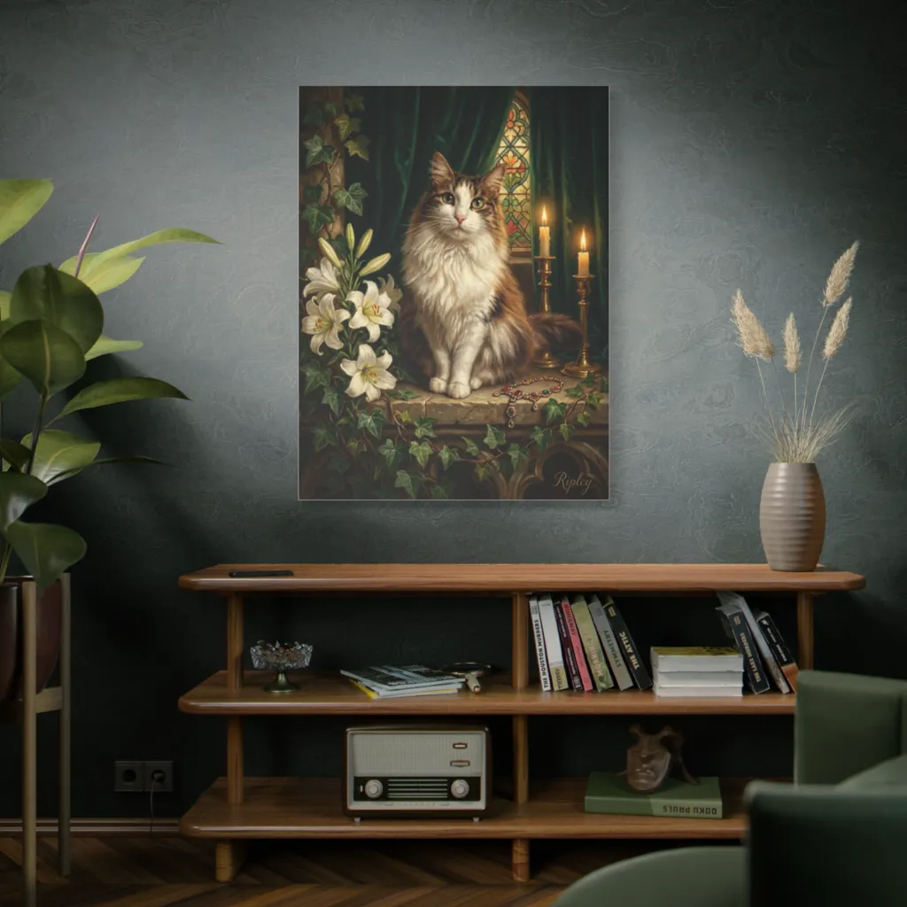 An opulent, regal cat commands attention in this richly textured, almost hyperreal portrait, evoking a mood of serene gothic charm.