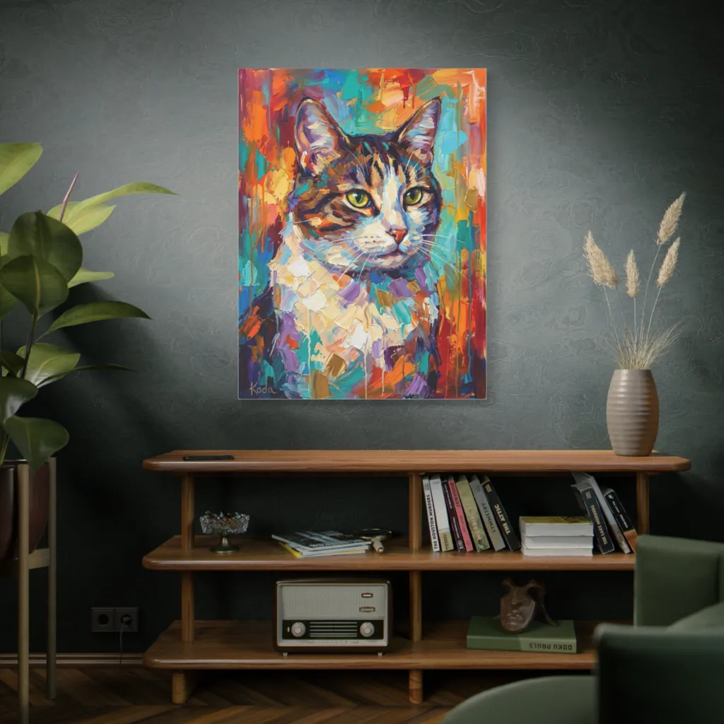Bold impasto strokes paint a captivating cat portrait, awash in vibrant, expressive colors that purr with playful charm. Rivers himself would be swept away by this vibrant cat, where strokes flow like playful streams of pure color.