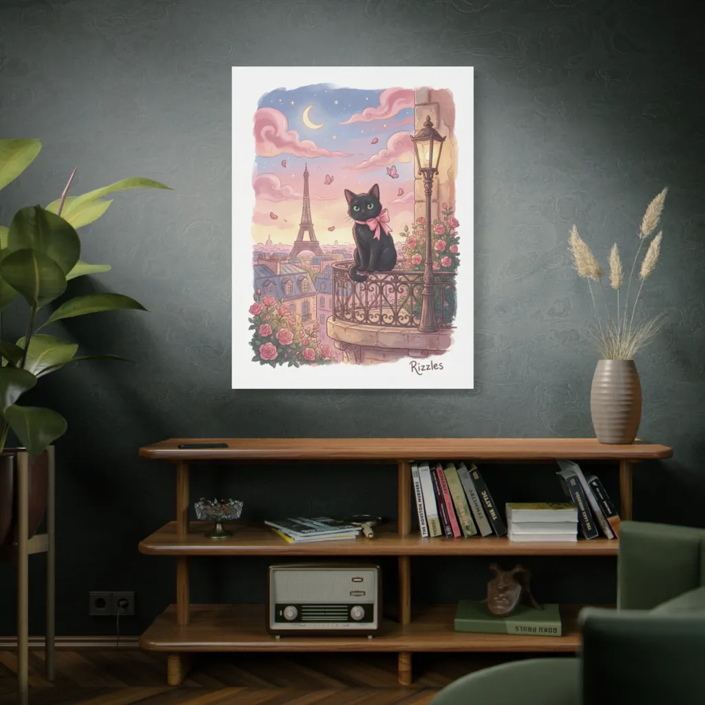"Rizzles, Parisian Twilight" possesses remarkable compositional balance. Its evocative pastels and commanding feline presence recall Belle Époque romanticism, certainly deserving a prominent gallery placement.