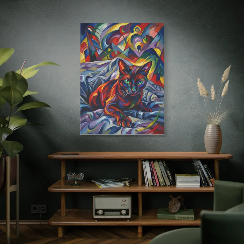 A flamboyant fauvist feline, a swirl of bold colors with hypnotic green eyes, lounges in an intensely vibrant, abstract dreamscape.
