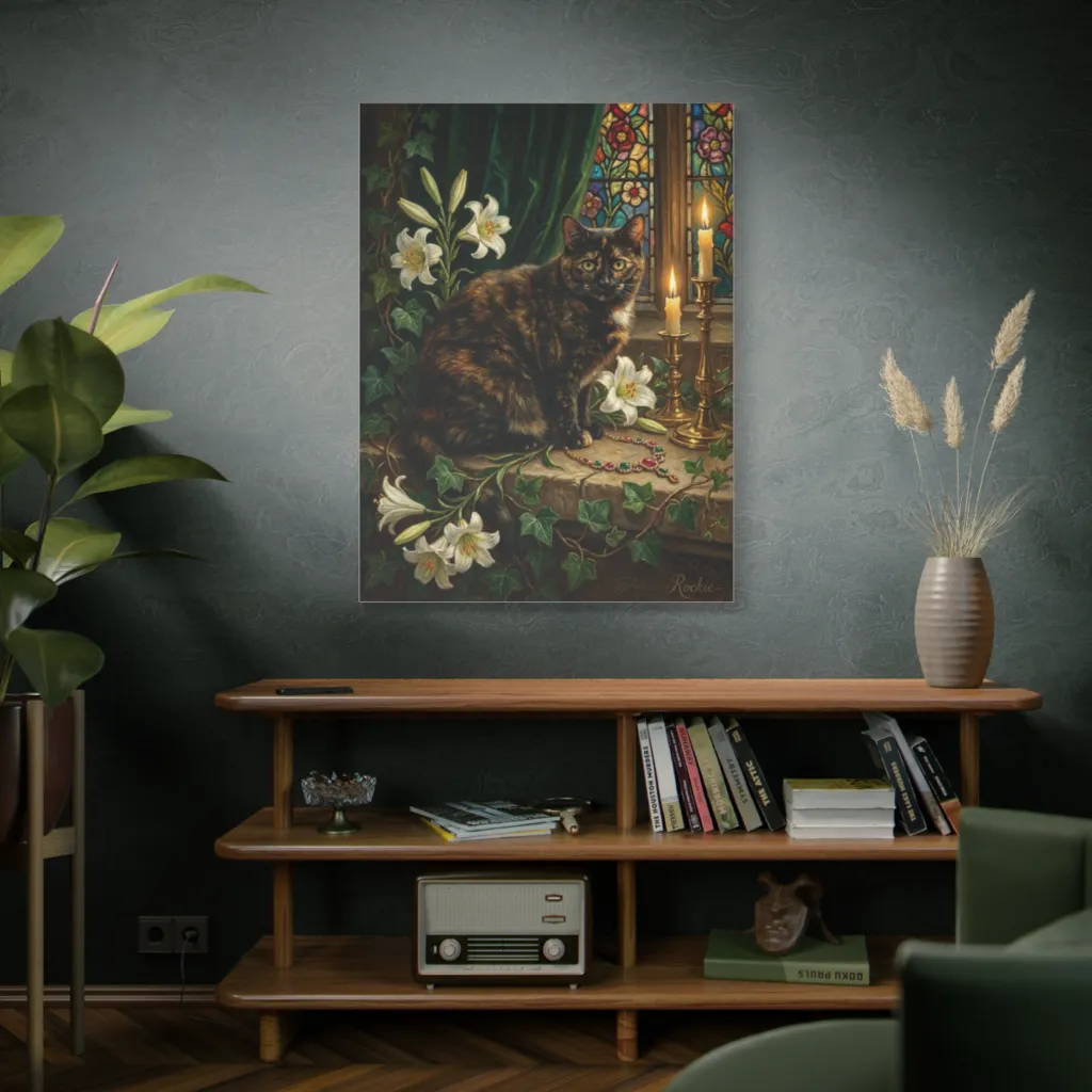 A sumptuously detailed portrait of a regal tortoiseshell cat amidst lilies, ivy, and jewels, evoking an air of quiet, mysterious opulence.