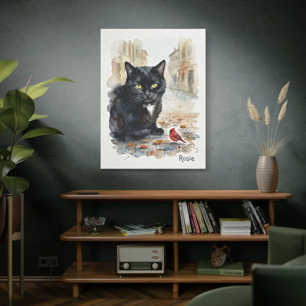 A charming watercolor portrays a watchful black cat and a bold cardinal on an autumnal street, capturing a whimsical, quiet encounter.