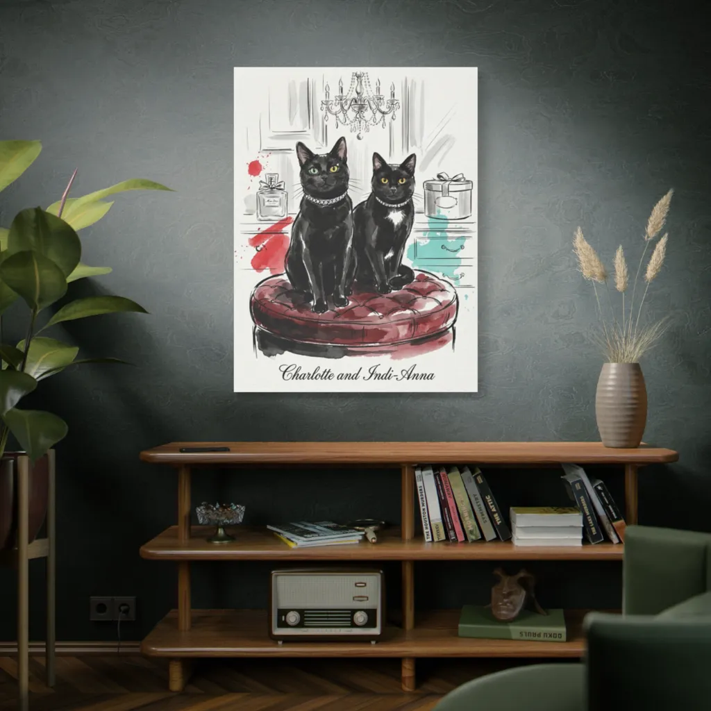 This chic watercolor sketch captures two bejeweled black cats exuding sophisticated mischief from their plush ottoman, amidst glamorous, splashy décor.