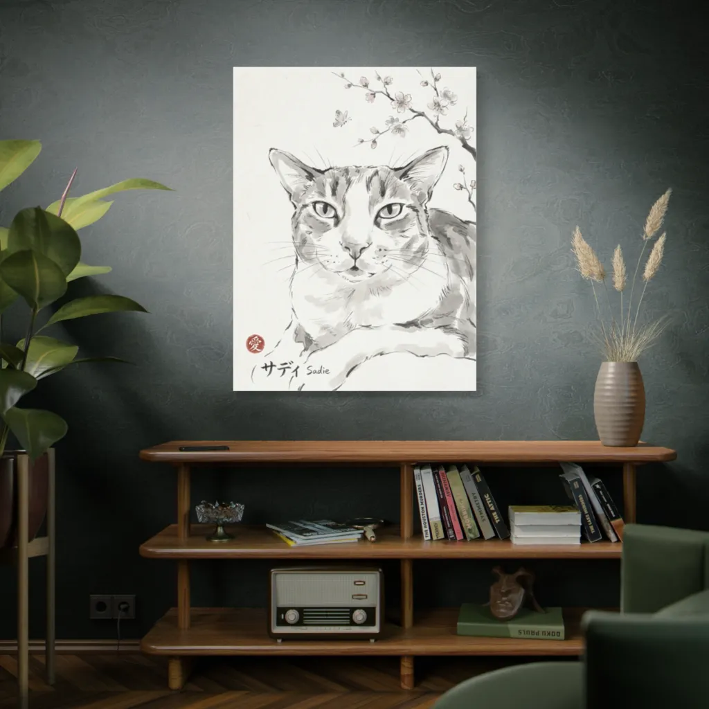 Sumi-e elegance captures a contemplative feline under delicate cherry blossoms, evoking serene, loving charm. Sadie, depicted with such grace, seems utterly unfazed by a mere butterfly.