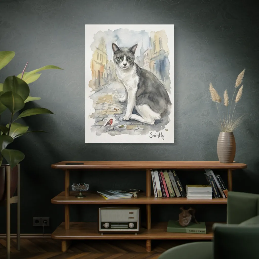 This piece radiates serene playfulness and cozy charm. Saintly’s watchful gaze invites a feeling of comforting presence. Seeing it daily would bring a gentle, heartwarming joy and peaceful nostalgia.