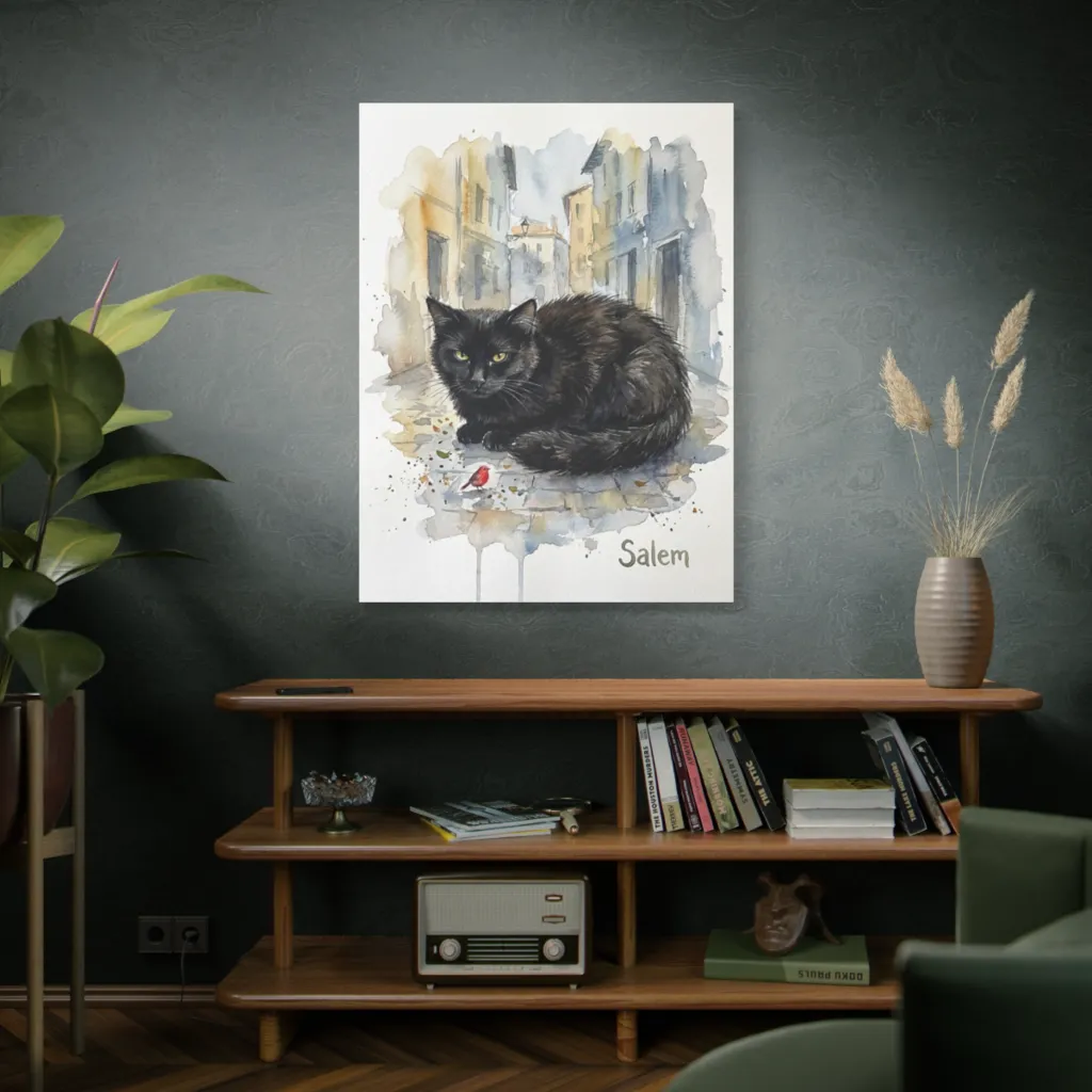 A moody watercolor depicts a wary black cat eyeing a tiny red bird on a cobblestone street, hinting at playful danger. Looks like Salem is having a staring contest with dinner, or perhaps just a new friend.