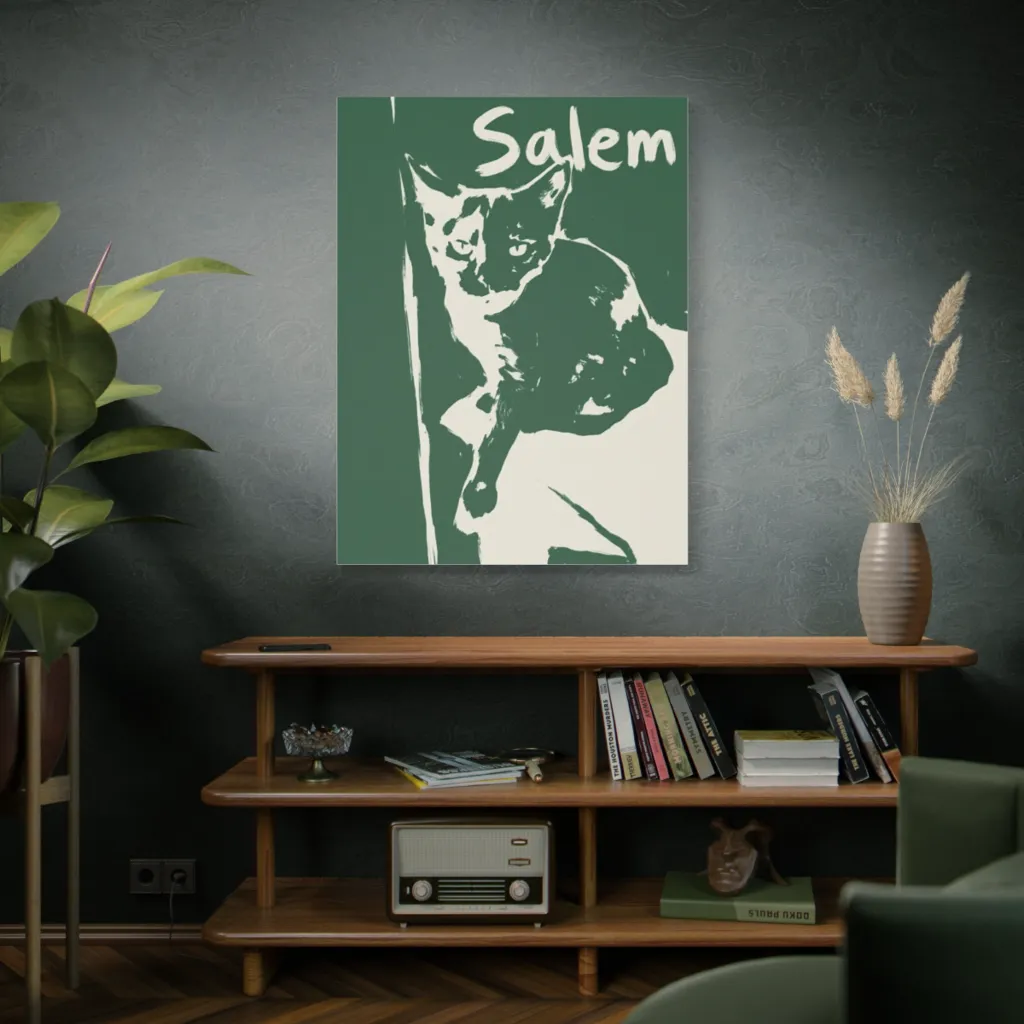 Salem, Veridian Gaze, with its bold Pop art allure, would shine above a sleek, dark-wood console in a sophisticated urban loft. Complement it with plush velvet and brushed brass for a truly chic statement.