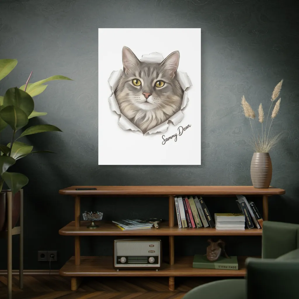 Sammy Dean's dynamic emergence creates a compelling composition, reminiscent of a Pop Art burst. Its magnetic presence commands the viewer's immediate attention, truly exhibition-worthy. A modern masterwork of feline allure.