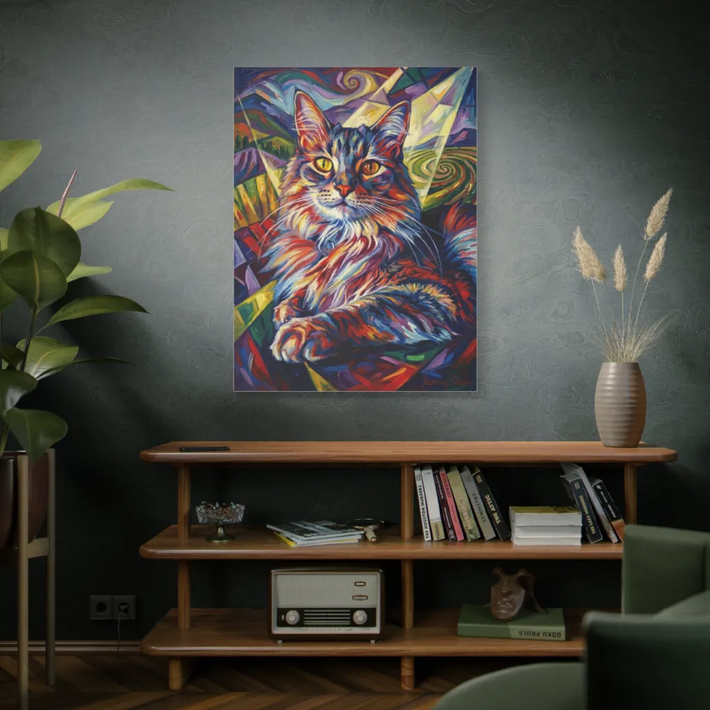 Sammy Dean's Luminous Gaze is groundbreaking! This digital portrait expertly fuses traditional feline subject matter with cutting-edge geometric whimsy. The psychedelic burst and enigmatic mood reveal innovative techniques, creating a bold, contemporary aesthetic. Truly a modern marvel.