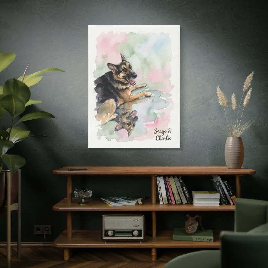 Vibrant watercolors capture two joyful German Shepherds, one comically mirrored, in a delightfully whimsical and loving portrait.