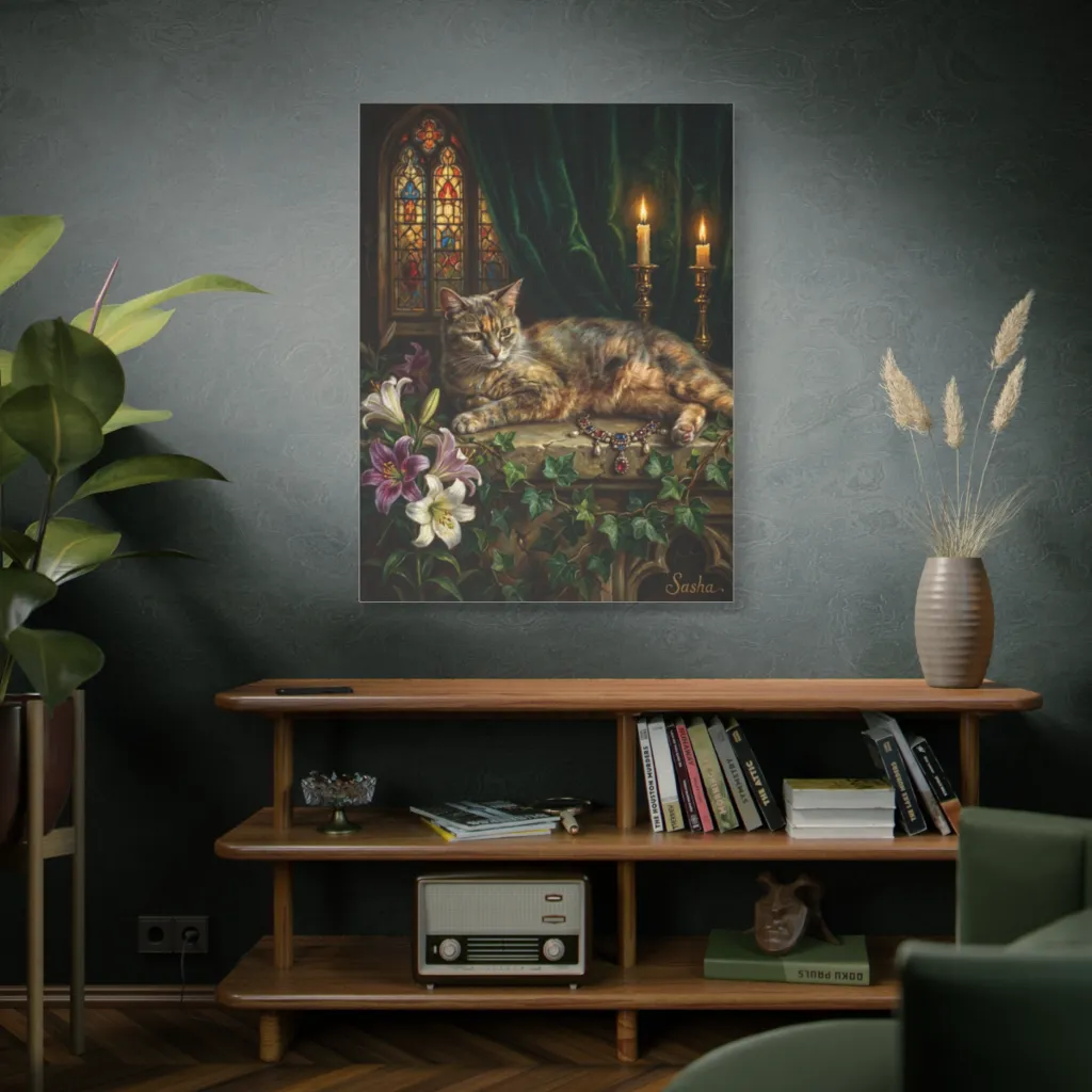 “Sasha's Gothic Repose” belongs above a raw ebony console, amidst a luxurious velvet lounge. Pair its opulent mystery with antiqued brass and deep sapphire textiles for a truly dramatic yet chic statement.