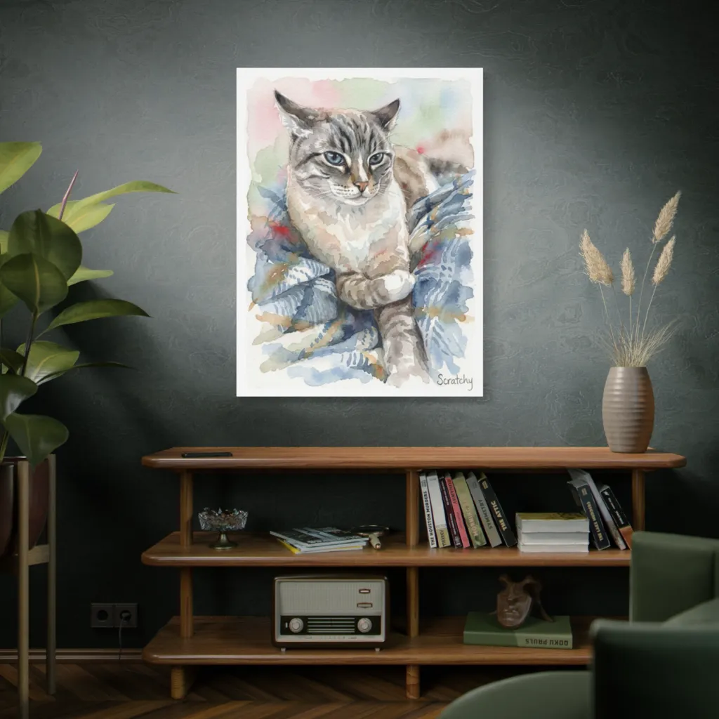 Scratchy's regal curl and piercing gaze beautifully capture his deep, contemplative soul. Those blue eyes reveal a gentle strategist, truly embodying his unique charm and personality. A masterpiece of feline introspection.