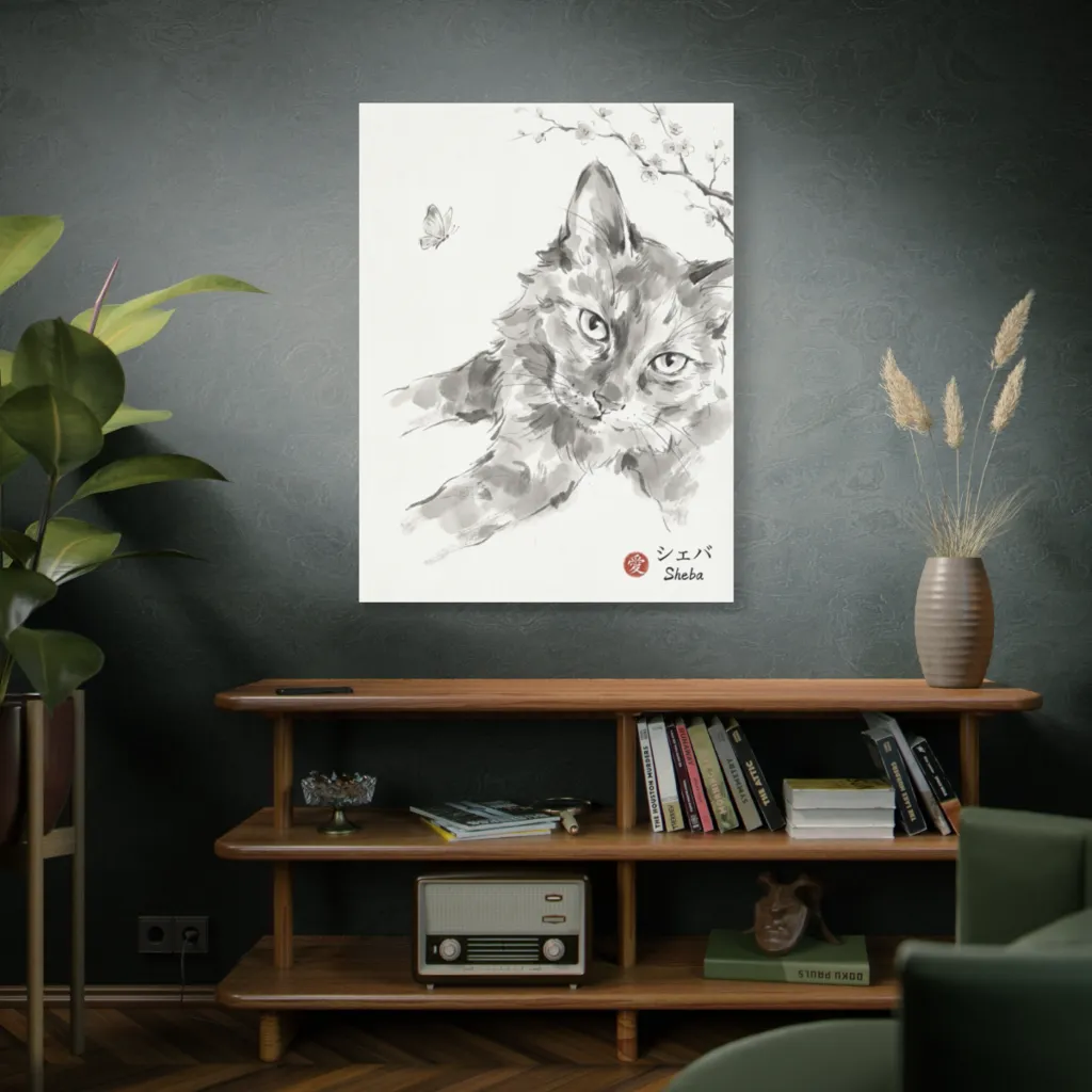 Sheba's playful serenity shines through her intent gaze at the butterfly, revealing a soul full of gentle curiosity. The expressive ink perfectly captures her unique feline grace and charming personality amidst the delicate blossoms.