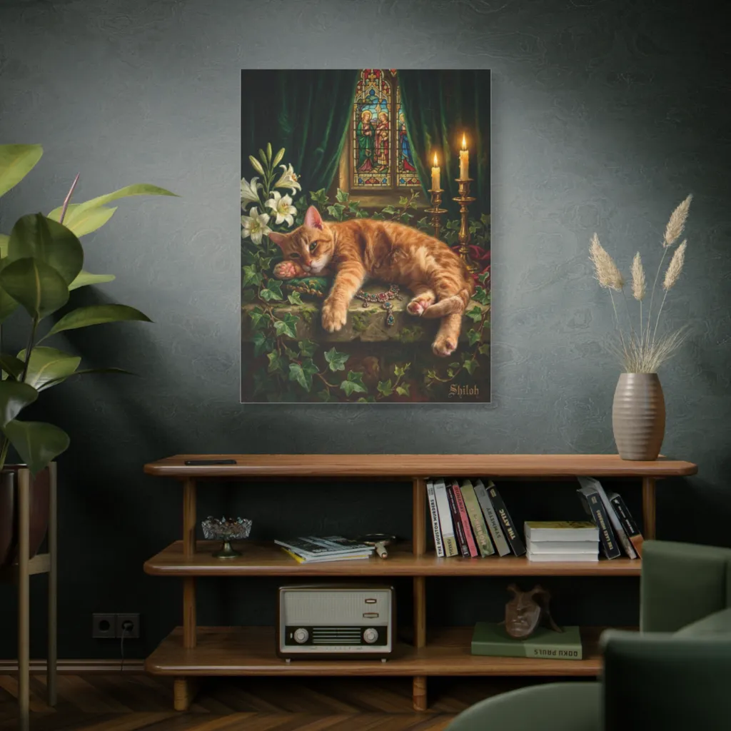 Shiloh's indolent grace, set against opulent gothic grandeur, commands immediate attention and remarkable presence. This piece elegantly merges historical richness with contemporary domesticity, truly exhibition-worthy.