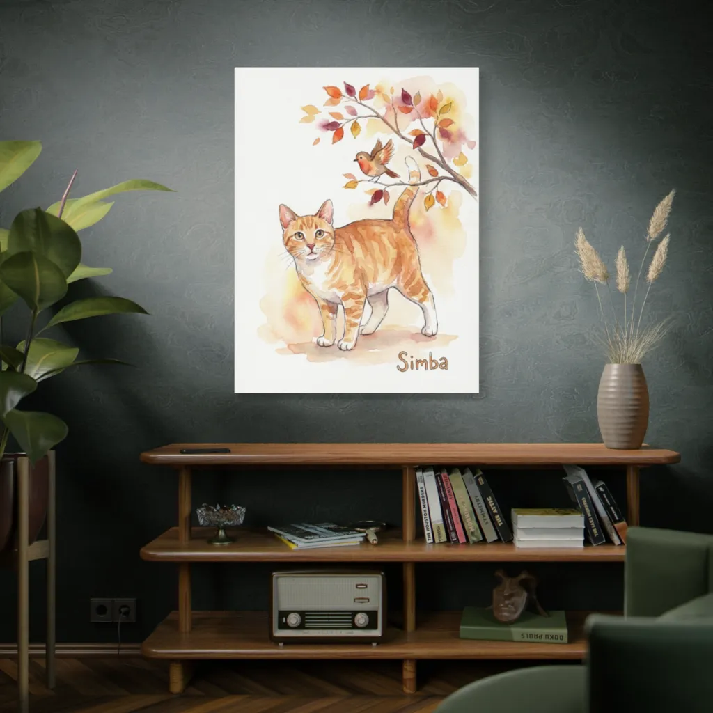 This charming watercolor captures an inquisitive tabby cat beneath an autumn branch with a cheeky robin, radiating gentle charm.