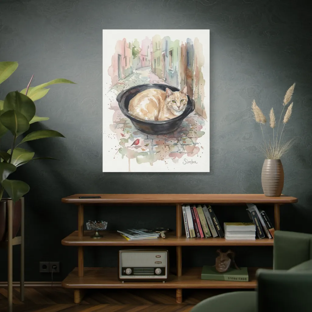 A charming watercolor depicts a serene ginger cat lounging in a basin on a quiet street, evoking a whimsical, tranquil mood.