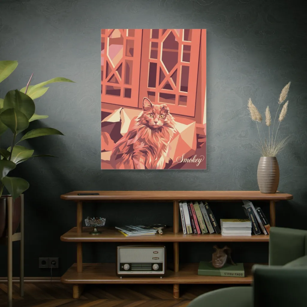 Smokey's polygons practically purr, a fluffy geometric marvel gazing regally from a warm, angular perch.